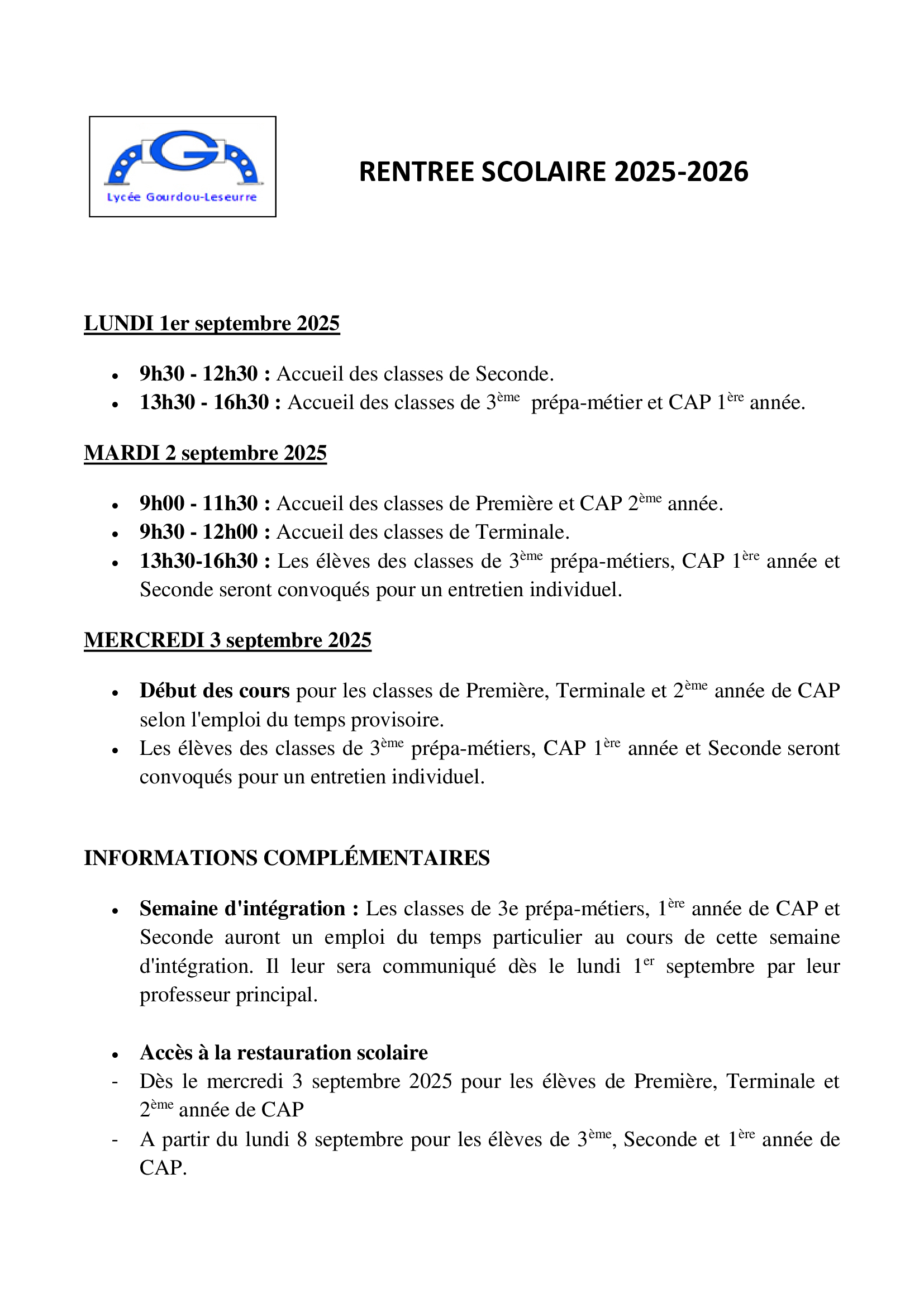 Jours et horaires de rentrée